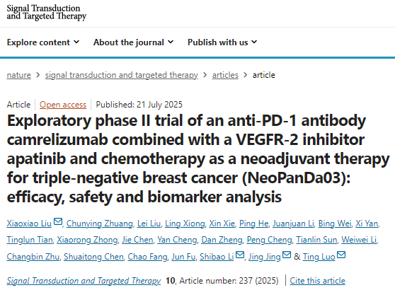 四川大學(xué)華西醫(yī)院羅婷教授團(tuán)隊(duì)此前開(kāi)展了一項(xiàng)單臂II期臨床試驗(yàn)(NeoPanDa03),創(chuàng)新性地將抗PD-1抗體卡瑞利珠單抗、VEGFR-2抑制劑阿帕替尼與化療聯(lián)合,用于早期或局部晚期三陰性乳腺癌(TNBC)的新輔助治療(NAT)。該三聯(lián)方案的總病理完全緩解(tpCR)率高達(dá)67.6%,顯示出顯著的臨床潛力。相關(guān)研究成果發(fā)表于Nature子刊Signal Transduction and Targeted Therapy(STTT)(IF: 52.7),啟明創(chuàng)投投資企業(yè)艾德生物(300685.SZ)深度參與此項(xiàng)研究,通過(guò)多組學(xué)分析揭示了療效相關(guān)生物標(biāo)志物。