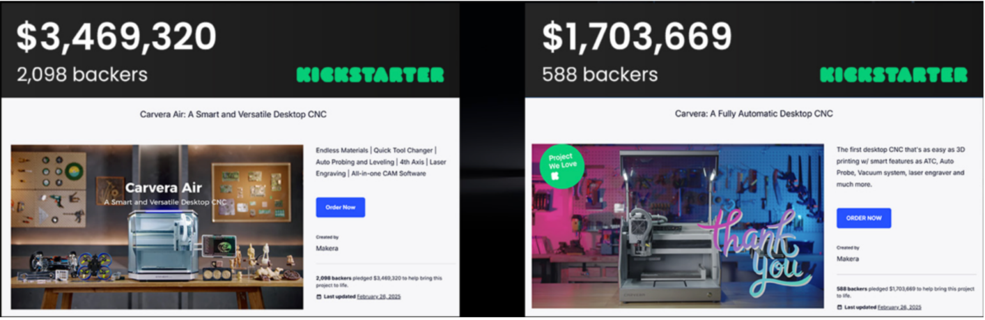 造物時(shí)代相繼推出兩款旗艦產(chǎn)品Carvera智能桌面CNC雕刻機(jī)、Carvera Air智能CNC設(shè)備,這兩款產(chǎn)品居于全球最大眾籌平臺(tái)Kickstarter的CNC品類歷史最高眾籌金額前兩位,并憑借多項(xiàng)創(chuàng)新技術(shù)在專業(yè)創(chuàng)客群體中建立了“高精度、易操作、多功能”的品牌認(rèn)知,成為桌面級(jí)精密加工領(lǐng)域的標(biāo)桿產(chǎn)品。